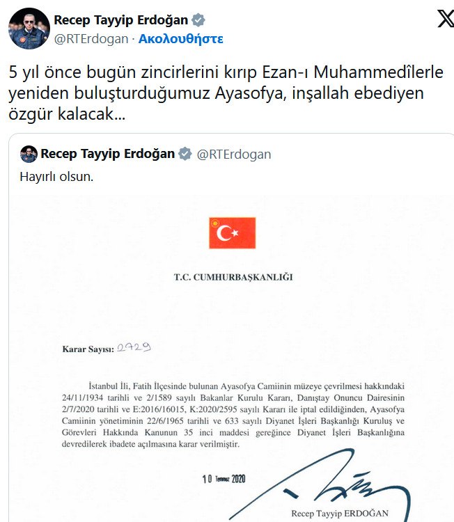 Με μια προκλητική ανάρτηση στο Χ o πρόεδρος της Τουρκίας Ρετζέπ Ταγίπ Ερντογάν «πανηγυρίζει» την μετατροπή της Αγίας Σοφίας σε τζαμί, πριν πέντε χρόνια.