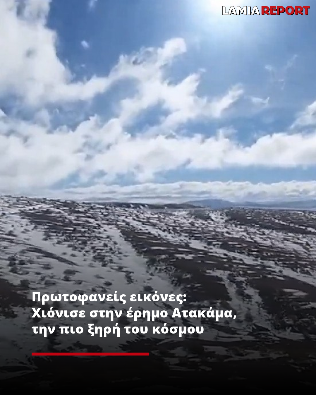 Το αστεροσκοπείο ALMA, σε υψόμετρο 2.900 μέτρων, ανέβασε εικόνες στα μέσα κοινωνικής δικτύωσης. «ΑΠΙΣΤΕΥΤΟ! Η έρημος Ατακάμα, η πιο άνυδρη στον κόσμο, ΕΙΝΑΙ ΚΑΛΥΜΜΕΝΗ ΜΕ ΧΙΟΝΙ» έγραψαν χαρακτηριστικά οι παρατηρητές, συνοδεύοντας την ανάρτηση με βίντεο από το τοπίο, που έμοιαζε βγαλμένο από άλλον πλανήτη.
