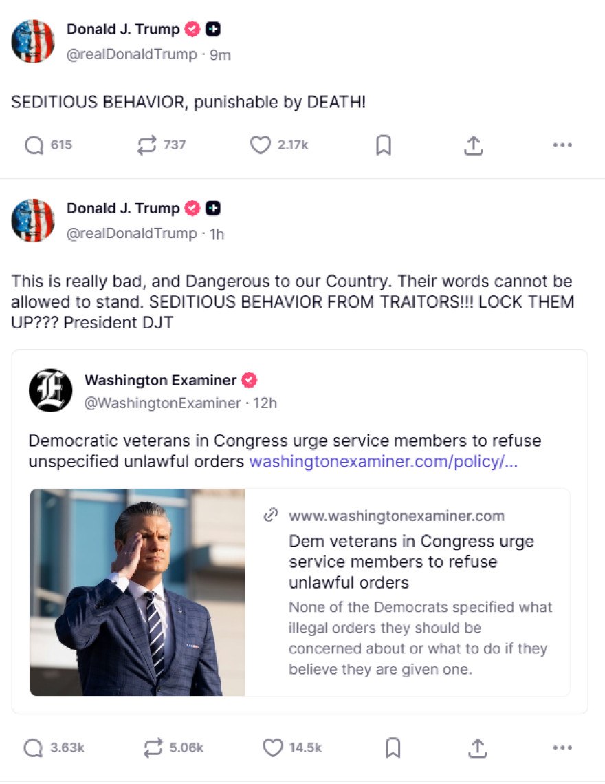 Σε ανάρτησή του στο Truth Social, ο Τραμπ ήταν ξεκάθαρος: «ΣΥΜΠΕΡΙΦΟΡΑ ΣΤΑΣΙΑΣΤΩΝ, τιμωρείται με ΘΑΝΑΤΟ!» έγραψε, αναφερόμενος στους έξι πολιτικούς του αντιπάλους, που κάλεσαν τον στρατό να αψηφά κυβερνητικές εντολές αμφιβόλου νομιμότητας.
