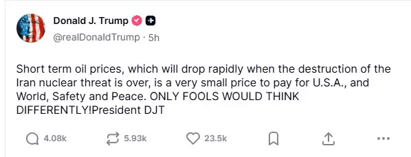 «Οι βραχυπρόθεσμες τιμές πετρελαίου, που θα μειωθούν γρήγορα όταν ολοκληρωθεί η εξουδετέρωση της ιρανικής πυρηνικής απειλής, είναι ένα πολύ μικρό τίμημα για την ασφάλεια και την ειρήνη των ΗΠΑ και του κόσμου. Μόνο οι ηλίθιοι θα σκέφτονταν διαφορετικά!», έγραψε χαρακτηριστικά.