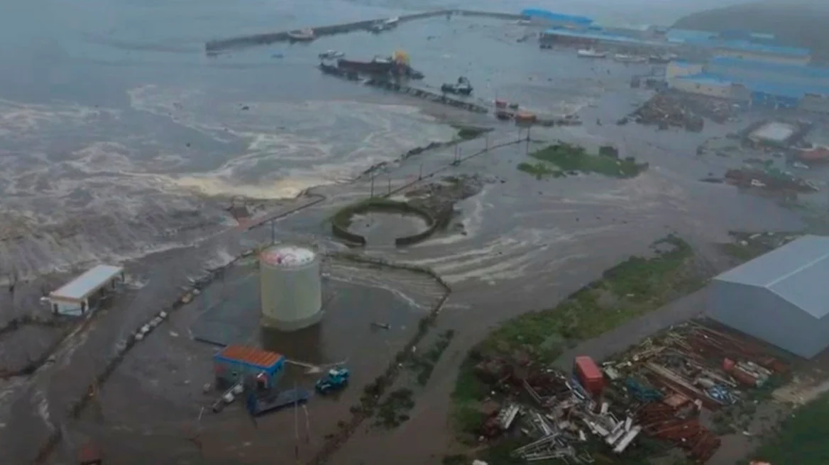 Eyewitness footage shows tsunami waves crashing onto the coastal town of Severo-Kurilsk in Russia's Sakhalin region following an earthquake in Kamchatka.
