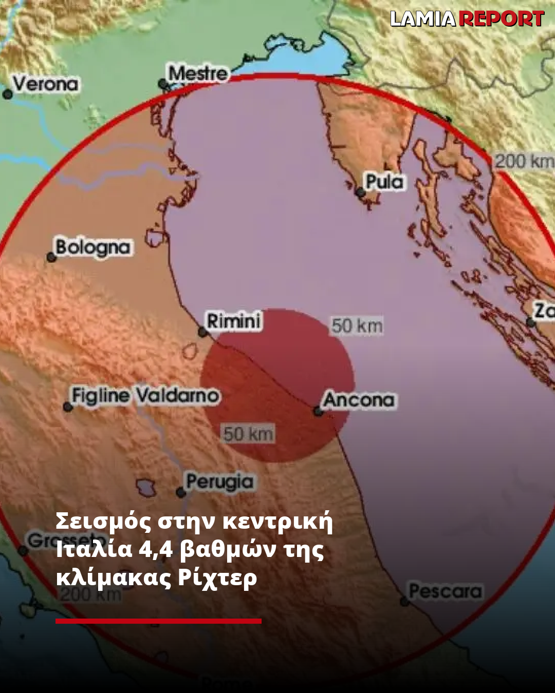 Σεισμός 4,4 βαθμών καταγράφηκε σήμερα Δευτέρα, 06.10.2025 στις 12.14 ώρα Ιταλίας, στην περιφέρεια Μάρκε της κεντρικής Ιταλίας.