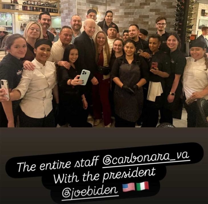 Σε βίντεο που κάνει τον γύρο του διαδικτύου, μπορεί να δει κανείς τον Τζο Μπάιντεν, περιτριγυρισμένο από πράκτορες των Μυστικών Υπηρεσιών, να περπατά με δυσκολία στην εξωτερική αυλή του εστιατορίου Carbonara στο Άρλινγκτον της Βιρτζίνια. Οι θαμώνες του εστιατορίου έδειχναν ξαφνιασμένοι και ενθουσιασμένοι, χειροκροτώντας τον καθώς έμπαινε στο εστιατόριο.