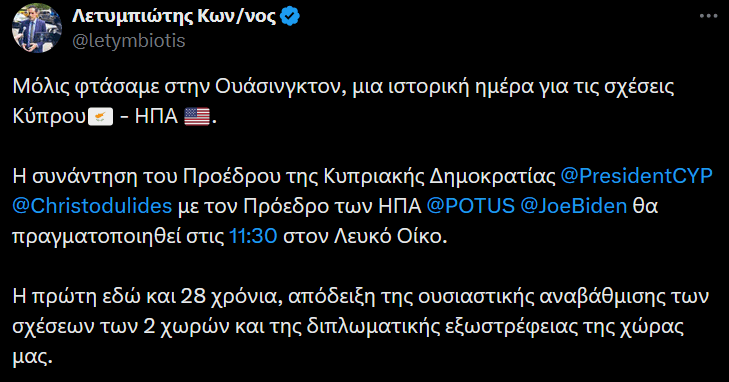 Σε ανάρτησή του στο «Χ», ο κ. Λετυμπιώτης μίλησε για «μια ιστορική ημέρα για τις σχέσεις Κύπρου- ΗΠΑ». Θα ακολουθήσουν δηλώσεις του προέδρου Χριστοδουλίδη μετά τη συνάντηση με τον Μπάιντεν.