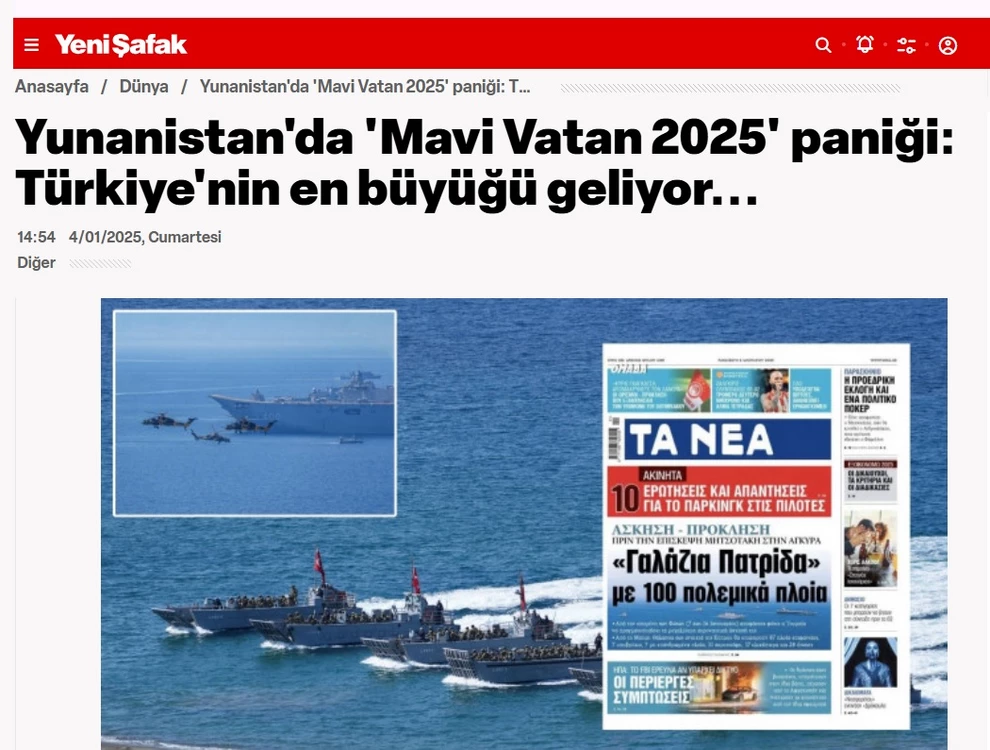 «Η “Καθημερινή” χρησιμοποίησε τον τίτλο: “Το πρώτο βήμα της Άγκυρας για το 2025 με τη Γαλάζια Πατρίδα” στο πρωτοσέλιδό της. Οι ελληνικές ειδησεογραφικές ιστοσελίδες έχουν τίτλους όπως “Πρόκληση της Γαλάζιας Πατρίδας”, “Η επίδειξη ισχύος της Τουρκίας” και “Η Τουρκία στο Αιγαίο με 100 πολεμικά πλοία”», γράφει χαρακτηριστικά η Yeni Safak στο άρθρο της, που έχει τίτλο: «Πανικός στην Ελλάδα».