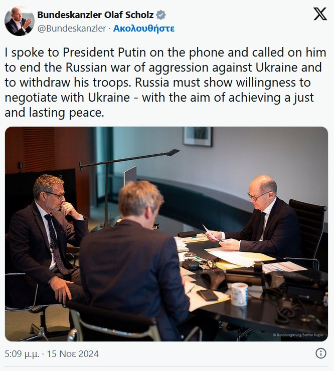 Ο Όλαφ Σολτς έκανε σχετική ανάρτηση στον λογαριασμό του στο «Χ», σχετικά με την συνομιλία που είχε με τον Βλάντιμιρ Πούτιν, την ίδια στιγμή που ο ρωσικός στρατός ετοιμάζει αντεπίθεση μεγάλης κλίμακας στο Κουρσκ με την υποστήριξη στρατευμάτων από την Βόρεια Κορέα.
