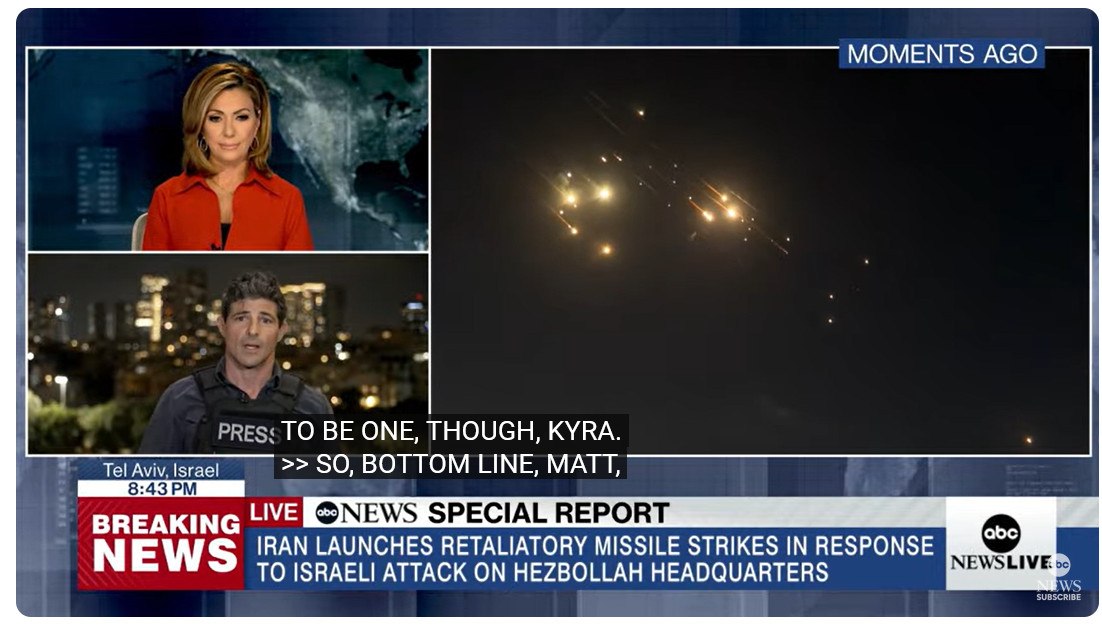Το ιρανικό πρακτορείο ειδήσεων Isna δημοσίευσε βίντεο με πυραύλους να πετούν πάνω από τον ουρανό της Τεχεράνης. Ισχυρές εκρήξεις ακούγονται στην κοιλάδα του Ιορδάνη, σύμφωνα με αυτόπτες μάρτυρες, Σειρήνες προειδοποίησης εισερχόμενων πυραύλων ηχούν σε όλο το Ισραήλ.