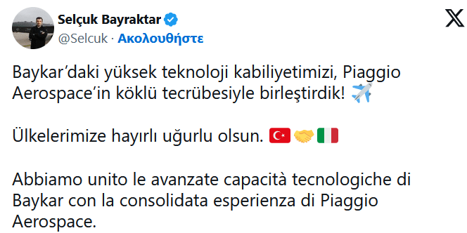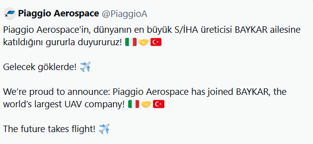 «Στοχεύουμε σε μακροπρόθεσμη ανάπτυξη, ενισχύοντας το ανθρώπινο δυναμικό και ενισχύοντας τη βιομηχανική συνεργασία μεταξύ Τουρκίας και Ιταλίας, αξιοποιώντας την ιστορία και το μηχανικό ταλέντο της Piaggio Aerospace. Η εταιρεία έχει πάνω από έναν αιώνα μηχανικής αριστείας. Βλέπουμε αυτήν την εξαγορά όχι ως μια απλή επιχειρηματική συναλλαγή, αλλά ως μια ευκαιρία να ενισχύσουμε την κληρονομιά της Piaggio Aerospace και να δώσουμε νέα ώθηση στις δυνατότητες σχεδιασμού και κατασκευής της ιταλικής αεροναυπηγικής βιομηχανίας», πρόσθεσε ακόμα ο Μπαϊρακτάρ.