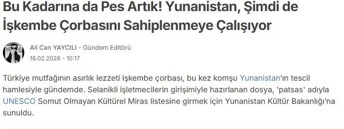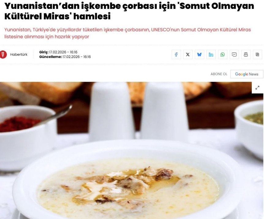 Η Habertürk σε δημοσίευμά της με τίτλο «Η Ελλάδα ξεκινά πρωτοβουλία για την άυλη πολιτιστική κληρονομιά του πατσά», ανέφερε ότι η Ελλάδα «ετοιμάζεται να συμπεριλάβει τη σούπα από πατσά, ένα πιάτο που καταναλώνεται στην Τουρκία εδώ και αιώνες, στον κατάλογο Άυλης Πολιτιστικής Κληρονομιάς της UNESCO».