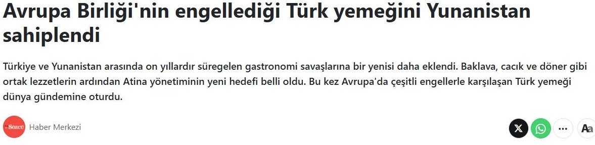 Ακόμη πιο αιχμηρή ήταν η προσέγγιση της Yeni Akit, η οποία με τίτλο «Έχουν βάλει στο μάτι την τουρκική κουζίνα! Οι Έλληνες κλέβουν άλλη μια από τις λιχουδιές μας» παρουσίασε την ελληνική πρωτοβουλία ως προσπάθεια «αρπαγής» στοιχείου της τουρκικής κουζίνας.