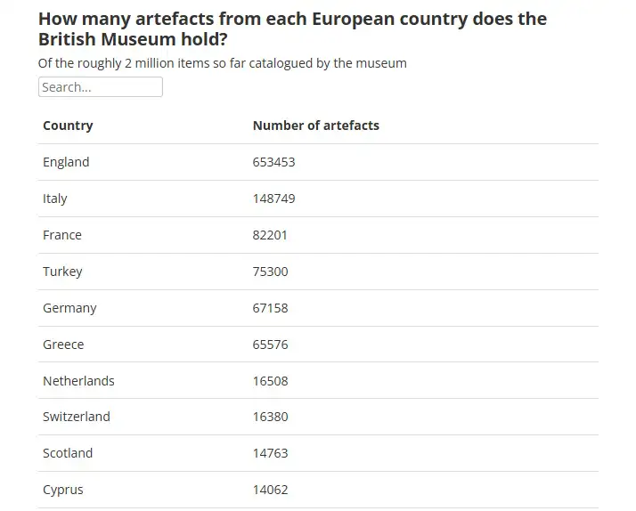 Η αλήθεια είναι πως το τεράστιο Βρετανικό Μουσείο έχει πλήθος εκθεμάτων από το εξωτερικό, αν και σύμφωνα με δημοσίευμα του euronews, τα περισσότερα εκθέματα έρχονται από τη Μεγάλη Βρετανία, την Αγγλία, τη Σκωτία, την Ουαλία ή τη Βόρεια Ιρλανδία, με μακράν το μεγαλύτερο μέρος να προέρχεται από την Αγγλία.