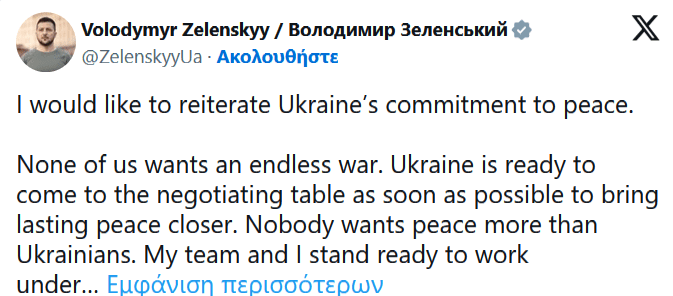 Ο ίδιος πρόσθεσε στην συνέχεια: «Κανείς δεν θέλει την ειρήνη περισσότερο από τους Ουκρανούς. Η ομάδα μου και εγώ είμαστε έτοιμοι να εργαστούμε υπό την ισχυρή ηγεσία του Προέδρου Τραμπ για να επιτύχουμε μια διαρκή ειρήνη».