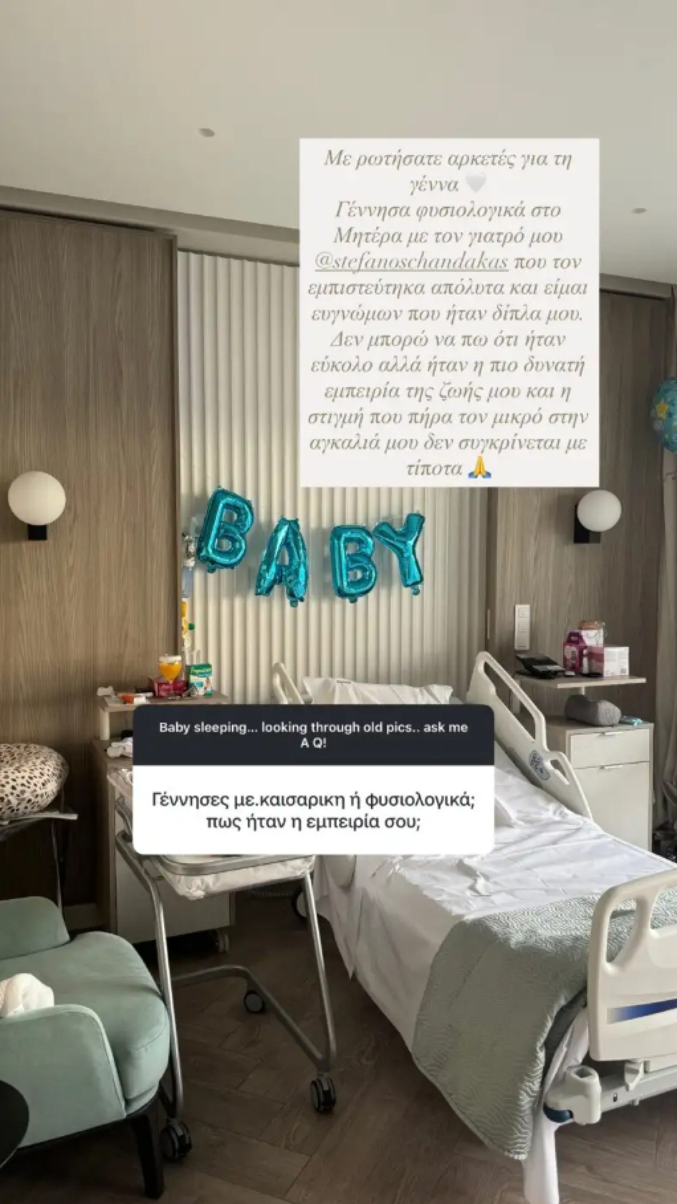 Έτσι, δέχτηκε πλήθος ερωτήσεων για τη μητρότητα, καθώς οι δυο τους είναι γονείς ενός μικρού αγοριού, του Βασίλη. Μιλώντας για τη γέννα, η ίδια έγραψε: «Με ρωτήσατε αρκετές για τη γέννα. Γέννησα φυσιολογικά με τον γιατρό μου που τον εμπιστεύτηκα απόλυτα και είμαι ευγνώμων που ήταν δίπλα μου. Δεν μπορώ να πω ότι ήταν εύκολο, αλλά ήταν η πιο δυνατή εμπειρία της ζωής μου και η στιγμή που πήρα τον μικρό στην αγκαλιά μου, δεν συγκρίνεται με τίποτα».