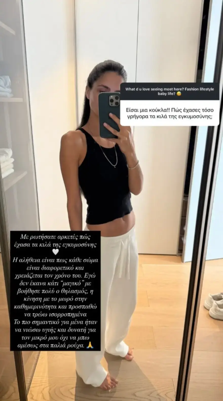 «Η αλήθεια είναι πως κάθε σώμα είναι διαφορετικό και χρειάζεται τον χρόνο του. Εγώ δεν έκανα κάτι “μαγικό”, με βοήθησε πολύ ο θηλασμός, η κίνηση με το μωρό στην καθημερινότητα και να προσπαθώ να τρώω ισορροπημένα. Το πιο σημαντικό για μένα ήταν να νιώσω υγιής», είπε κλείνοντας.