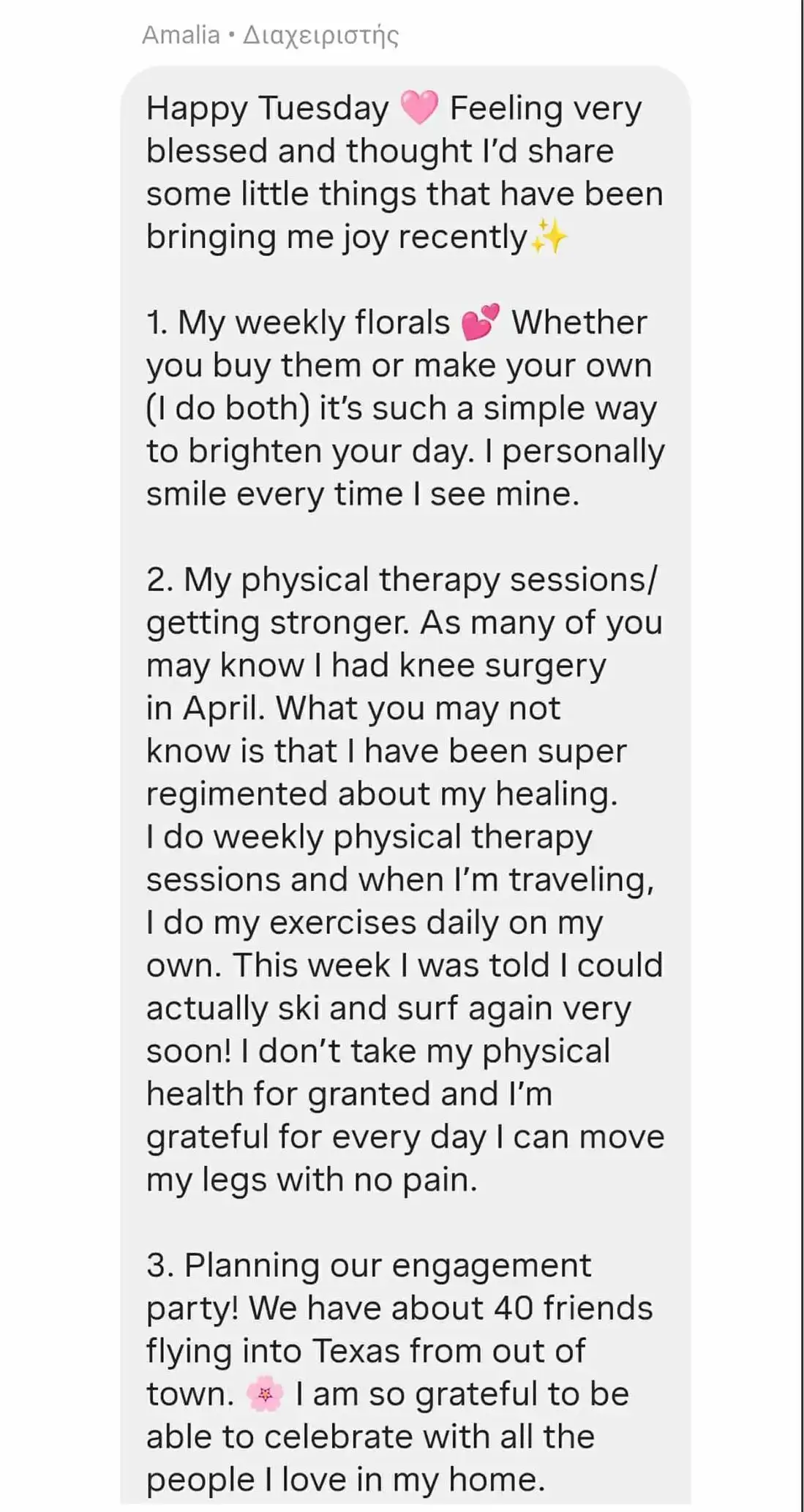 «Νιώθω πολύ ευλογημένη και σκέφτηκα ότι θα ήθελα να μοιραστώ μερικά μικρά πράγματα που μου φέρνουν χαρά τις τελευταίες ημέρες», έγραψε αρχικά στο Instagram και αμέσως μετά ενημέρωσε ότι διοργανώνει πάρτι αρραβώνων με τον αγαπημένο της.