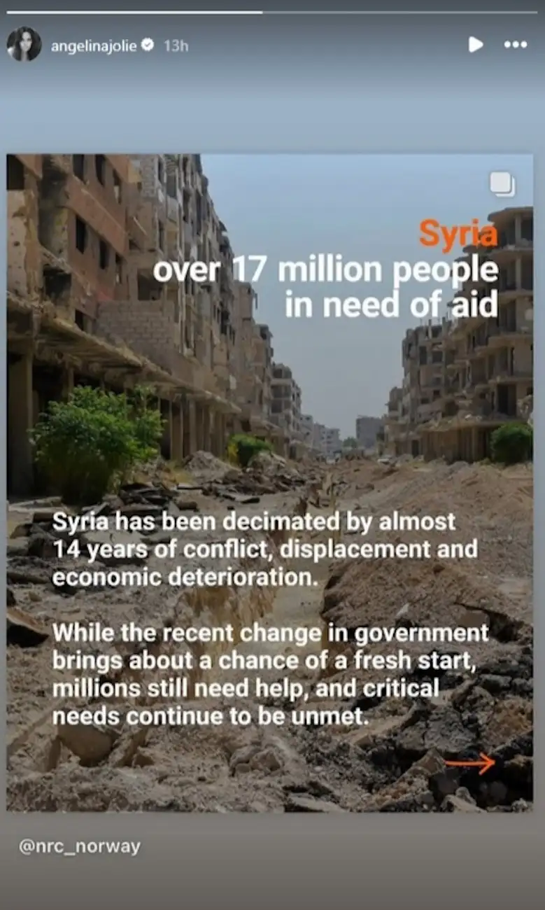 «Συρία: Πάνω από 17 εκατομμύρια άνθρωποι χρειάζονται βοήθεια», υπογράμμισε σε insta story η Τζολί και πρόσθεσε.