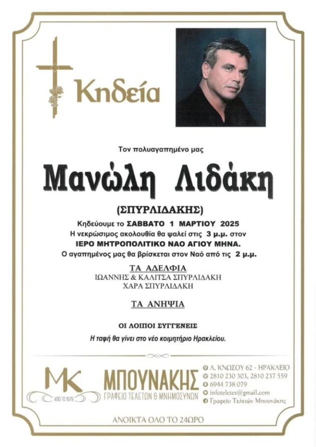 Η κηδεία του θα πραγματοποιηθεί τις επόμενες ημέρες στο Ηράκλειο, με τους συγγενείς να μην έχουν ανακοινώσει ακόμη την ακριβή ημέρα.