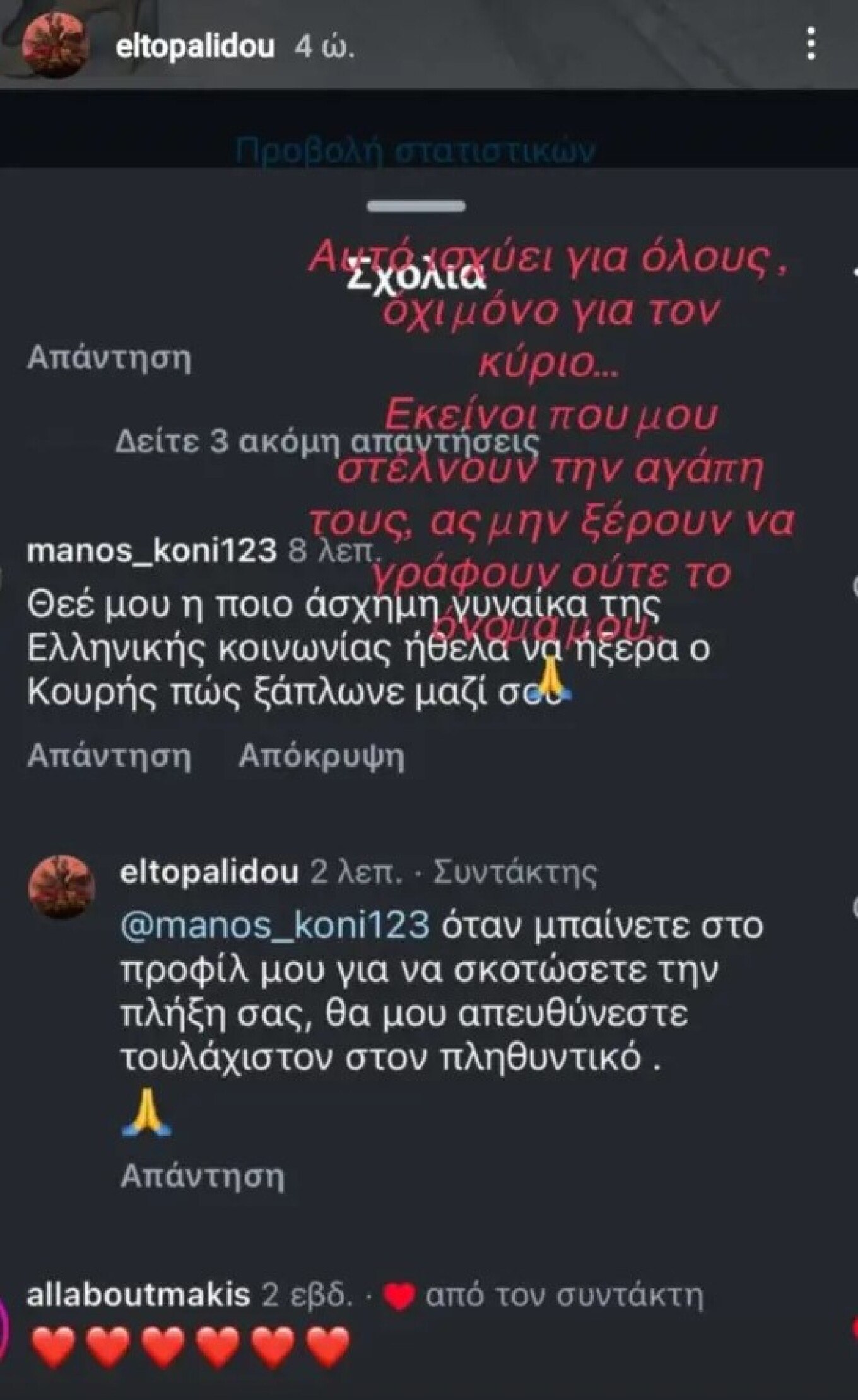 Η αντίδραση της ηθοποιού και χορεύτριας ήρθε άμεσα, όπως καταγράφει το protothema.gr: «Όταν μπαίνετε στο προφίλ μου για να σκοτώσετε την πλήξη σας, θα μου απευθύνεστε τουλάχιστον στον πληθυντικό». Μάλιστα, δημοσιοποίησε τη συνομιλία, ανεβάζοντας σχετικό στιγμιότυπο στα stories της, προσθέτοντας: «Αυτό ισχύει για όλους, όχι μόνο για τον κύριο… Εκείνοι που μου στέλνουν την αγάπη τους, ας μην ξέρουν να γράφουν ούτε το όνομά μου».