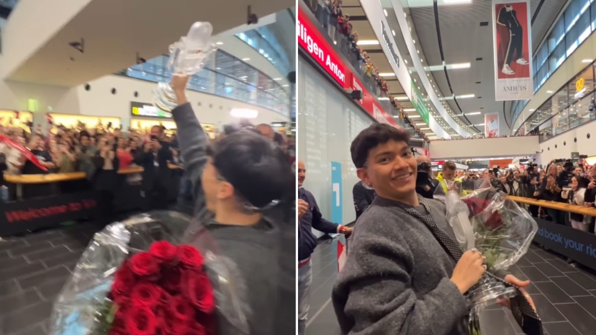 Ο 24χρονος τενόρος εμφανίστηκε χαμογελαστός, κρατώντας ένα μπουκέτο με κόκκινα τριαντάφυλλα και το τρόπαιο της Eurovision στα χέρια του, ενώ κατέβαινε από το αεροπλάνο μέσα σε κλίμα ενθουσιασμού.