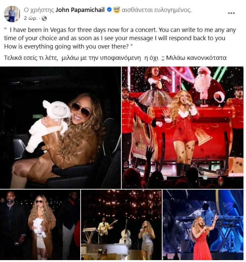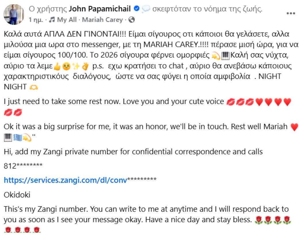 Όπως έγραψε ο Γιάννης Παπαμιχαήλ για τη συνομιλία του με τη Μαράια Κάρεϊ, προσθέτοντας ότι θα επανέλθει με πειστήρια: «Καλά αυτά απλά δεν γίνονται. Είμαι σίγουρος ότι κάποιοι θα γελάσετε, αλλά μιλούσα μια ώρα στο Messenger με τη Μαράια Κάρεϊ. Πέρασε μισή ώρα, για να είμαι σίγουρος 100/100. Το 2026 σίγουρα φέρνει ομορφιές. Καλή σας νύχτα, τα λέμε αύριο. Υ.Γ. Έχω κρατήσει τη συνομιλία, αύριο θα ανεβάσω κάποιους χαρακτηριστικούς διαλόγους, ώστε να σας φύγει η όποια αμφιβολία. Καληνύχτα» και πρόσθεσε: «Χρειάζομαι λίγο ξεκούραση τώρα. Σ' αγαπώ εσένα και τη γλυκιά φωνή σου. Εντάξει, ήταν μια μεγάλη έκπληξη για εμένα, ήταν τιμή μου, θα είμαστε σε επαφή. Ξεκουράσου καλά Μαράια».