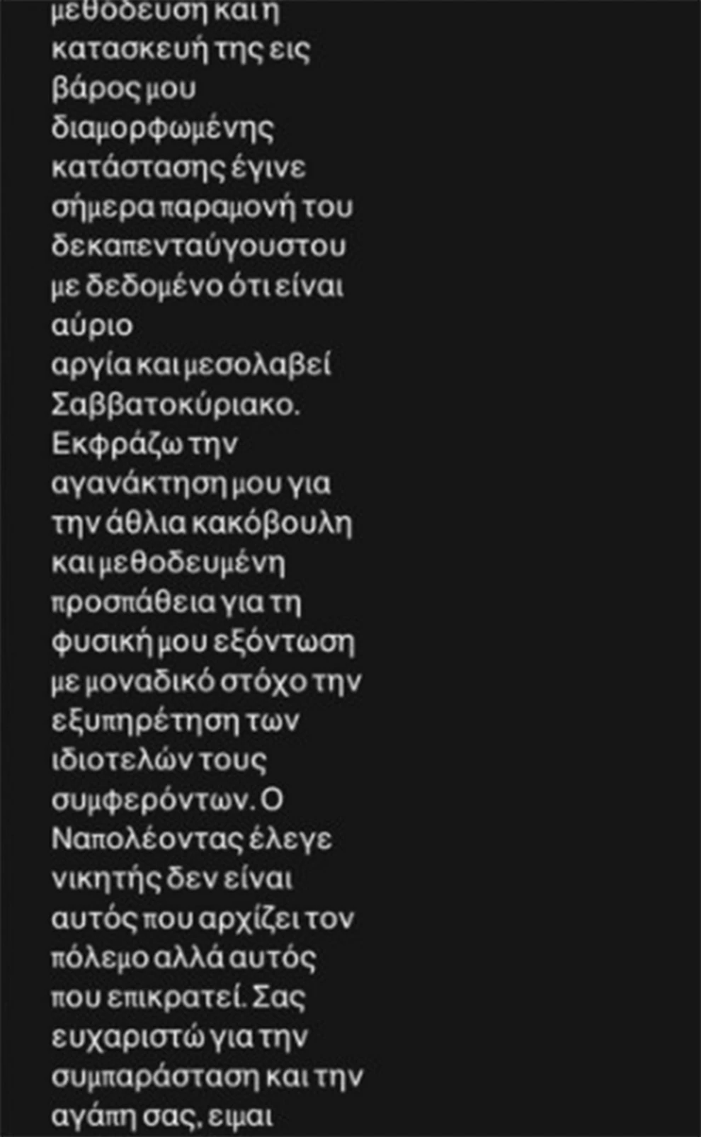 Εκφράζω την αγανάκτησή μου για την άθλια κακόβουλη και μεθοδευμένη προσπάθεια για τη φυσική μου εξόντωση με μοναδικό στόχο την εξυπηρέτηση των ιδιοτελών τους συμφερόντων. Ο Ναπολέοντας έλεγε νικητής δεν είναι αυτός που αρχίζει τον πόλεμο αλλά αυτός που επικρατεί. Σας ευχαριστώ για τη συμπαράσταση και την αγάπη σας. Είμαι υγιής, ακμαίος και δυνατός».