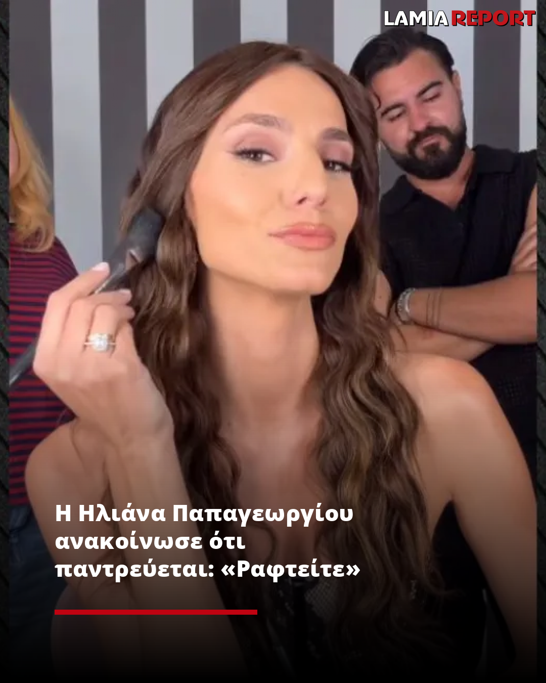 Έτσι, ανάρτησε ένα βίντεο στον προσωπικό της λογαριασμό στο Instagram όπου ποζάρει στον καθρέφτη μαζί με τους συνεργάτες της και ολοκληρώνει το μακιγιάζ της, ενώ τον παράμεσό της στολίζει ένα εντυπωσιακό μονόπετρο δαχτυλίδι.