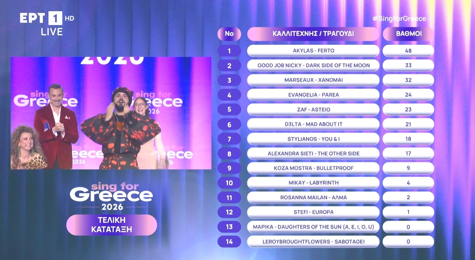 - Η ψήφος των τηλεθεατών μέτρησε διπλά. Το 24άρι το έδωσαν στο Ferto του Ακύλα (ακολούθησε το «Dark Side of the Moon» του Good Job Nicky - 20 βαθμοί)