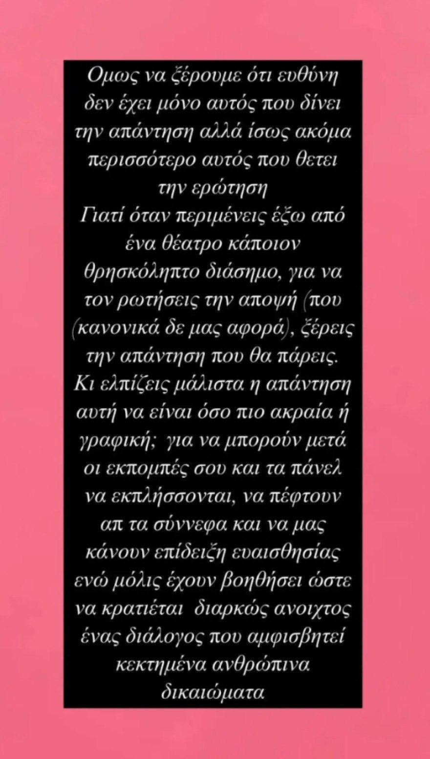 Πιο συγκεκριμένα, η ηθοποιός έγραψε σε story στον προσωπικό της λογαριασμό στο Instagram: «Όμως να ξέρουμε ότι ευθύνη δεν έχει μόνο αυτός που δίνει την απάντηση, αλλά ίσως ακόμα περισσότερο αυτός που θέτει την ερώτηση. Γιατί όταν περιμένεις έξω από ένα θέατρο κάποιον θρησκόληπτο διάσημο, για να ρωτήσεις την άποψή του (που κανονικά δεν μας αφορά), ξέρεις την απάντηση που θα πάρεις. Κι ελπίζεις μάλιστα, η απάντηση αυτή να είναι όσο πιο ακραία ή γραφική; Για να μπορούν μετά οι εκπομπές σου και τα πάνελ να εκπλήσσονται, να πέφτουν από τα σύννεφα και να μας κάνουν επίδειξη ευαισθησίας, ενώ μόλις έχουν βοηθήσει ώστε να κρατιέται διαρκώς ανοιχτός ένας διάλογος που αμφισβητεί κεκτημένα ανθρώπινα δικαιώματα».