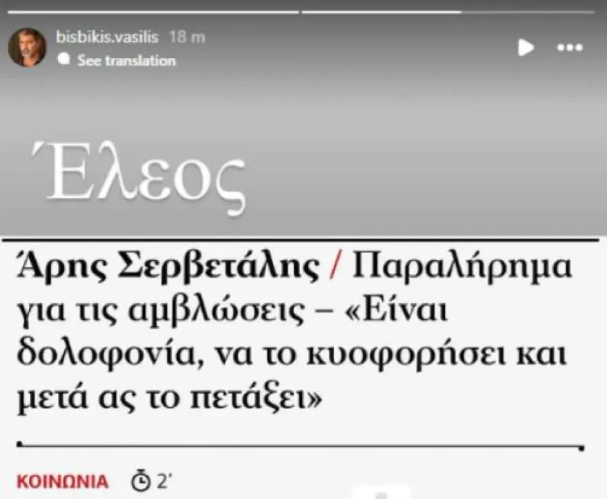 Ανάμεσα σε εκείνους που τοποθετήθηκαν δημόσια, εκφράζοντας τη δυσαρέσκειά τους για τις δηλώσεις του Άρη Σερβετάλη ήταν κι ο Βασίλης Μπισμπίκης, ο οποίος δεν άφησε ασχολίαστα όσα είπε ο συνάδελφός του. Μέσα από μέσα από μία δημοσίευση στα social media, έδειξε τον εκνευρισμό του. Συγκεκριμένα, αναδημοσίευσε ένα σχετικό άρθρο και έγραψε τη λέξη «Έλεος».