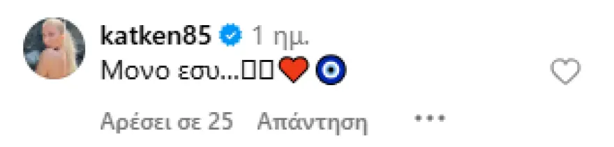 Στην πρώτη φωτογραφία, ποζάρει δίπλα στη σύντροφό του, η οποία γέρνει το κεφάλι της πάνω του και χαμογελά πλατιά στον φακό. Ο ίδιος μπορεί να μην έγραψε κάτι στη λεζάντα που συνοδεύει τα στιγμιότυπα, όμως η Κατερίνα Καινούργιου φρόντισε να σχολιάσει την ανάρτησή του. Πιο συγκεκριμένα, η παρουσιάστρια επιβεβαίωσε για ακόμα μία φορά τον έρωτά της για εκείνον, γράφοντάς του: «Μόνο εσύ». Δείτε το σχόλιο