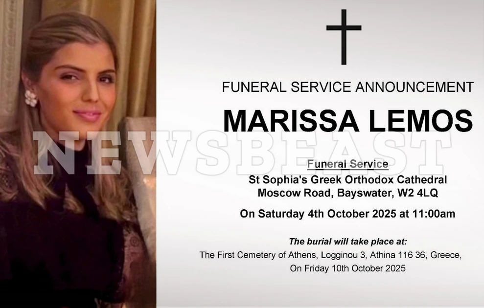 Σε ανακοίνωση κηδείας που δημοσιεύτηκε, έγιναν γνωστές οι λεπτομέρειες για τη νεκρώσιμη ακολουθία και την ταφή της Μαρίσσας Λαιμού που βρέθηκε νεκρή από την οικονόμο της στο Λονδίνο στις 11 Σεπτεμβρίου. Η 30χρονη σύμφωνα με πληροφορίες άφησε την τελευταία της πνοή από σήψη μετά από τσίμπημα εντόμου.
