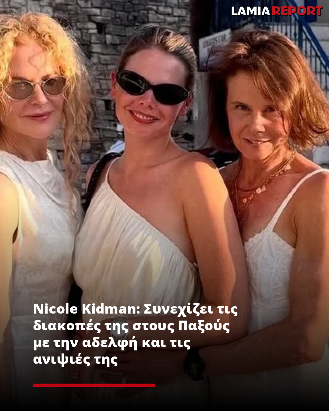 Οι δύο αδερφές, όπως αναφέρει το marieclaire.gr, κάνουν μαζί διακοπές στους Παξούς και η μία κόρη της Antonia το αποκάλυψε στο Instagram. Σε ένα καρουζέλ φωτογραφιών στο οποίο βλέπουμε στιγμιότυπα από τις βουτιές, τα φαγητά και τους χορούς της 27χρονης με την αδερφή και τους φίλους τους, ένα στιγμιότυπο δείχνει τη Nicole Kidman με μακρύ λευκό φόρεμα να ποζάρει μαζί με την αδερφή και την ανιψιά της.