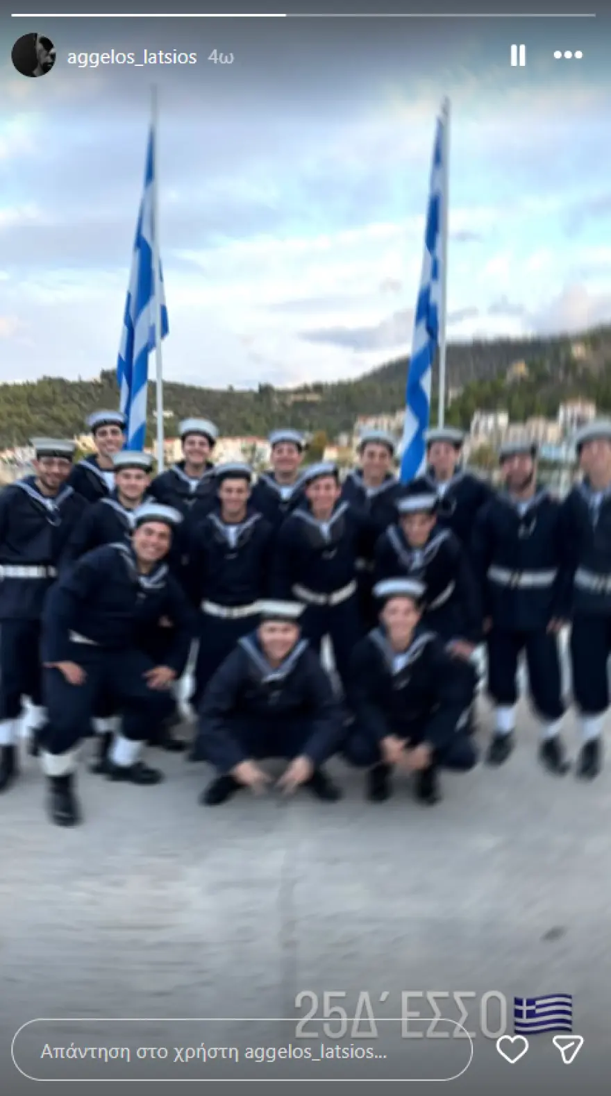 Νωρίτερα, μία φωτογραφία από τη θητεία του στο Πολεμικό Ναυτικό δημοσίευσε και ο Άγγελος Λάτσιος. Πιο αναλυτικά, κοινοποίησε μια εικόνα με άτομα της σειράς του, αναφέροντας ότι έχει καταταγεί στην 25 Δ’ ΕΣΣΟ. Στο στιγμιότυπο, το οποίο έχει θολώσει, η ομάδα ποζάρει μπροστά από ελληνικές σημαίες, φορώντας τον ναυτικό σκούφο και την επίσημη στολή του Πολεμικού Ναυτικού.