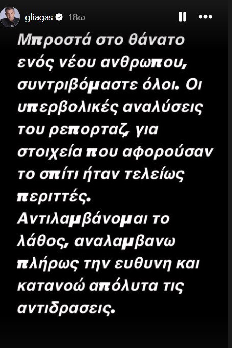 Ο Γιώργος Λιάγκας της εκπομπής, μετά από τις αντιδράσεις έκανε μια ανάρτηση στον προσωπικό του λογαριασμό στο Instagram αναλαμβάνοντας την ευθύνη. «Μπροστά στο θάνατο ενός νέου ανθρώπου, συντριβόμαστε όλοι. Οι υπερβολικές αναλύσεις του ρεπορτάζ, για στοιχεία που αφορούσαν στο σπίτι ήταν τελείως περιττές. Αντιλαμβάνομαι το λάθος, αναλαμβάνω πλήρως την ευθύνη και κατανοώ απόλυτα τις αντιδράσεις» έγραψε ο παρουσιαστής.