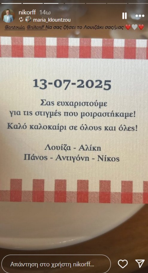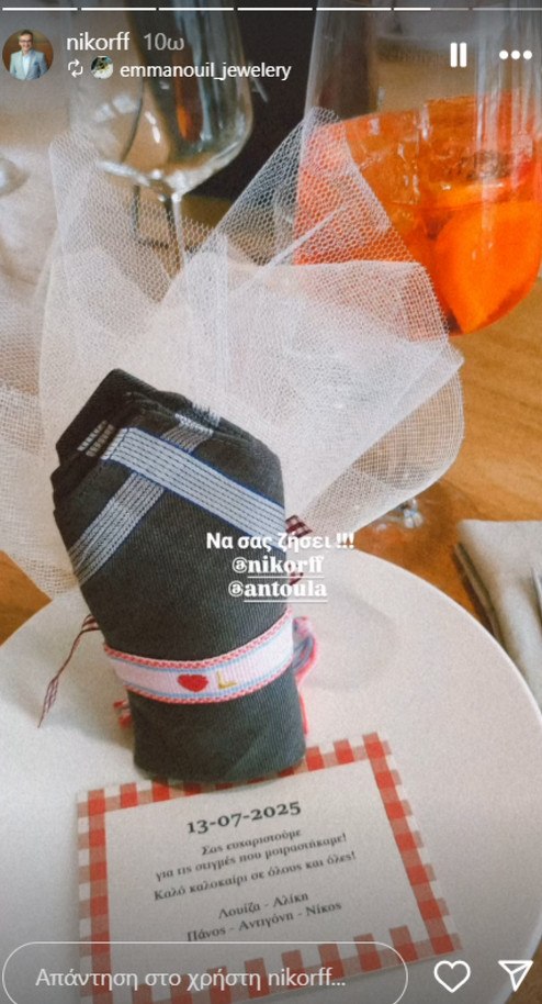 Στη συνέχεια, ο ηθοποιός αναδημοσίευσε στα social media στιγμιότυπα που είχαν αναρτήσει ορισμένοι καλεσμένοι του, από το τραπέζι της βάφτισης, αλλά και με τα βαφτιστικά ρούχα του παιδιού του.