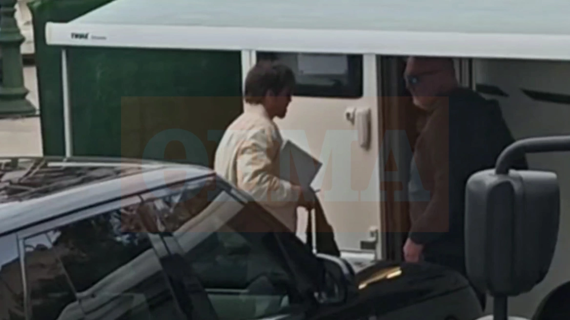 Το τεχνικό συνεργείο μεταφέρει εξοπλισμό στο μέγαρο της πλατείας Κοτζιά, ενώ ο διάσημος ηθοποιός έφτασε στο σημείο λίγο πριν τις 15:00