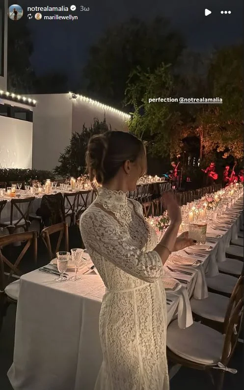 Στις φωτογραφίες και τα βίντεο που μοιράστηκε και πάλι στο λογαριασμό της στο Instagram, η Αμαλία Κωστοπούλου έκλεψε την παράσταση με ένα εξαιρετικά κομψό φόρεμα του Έλληνα σχεδιαστή Costarellos. Το δαντελένιο νυφικό ήταν εφαρμοστό, με ψηλή λαιμόκοψη και σκίσιμο στο μπροστινό μέρος.