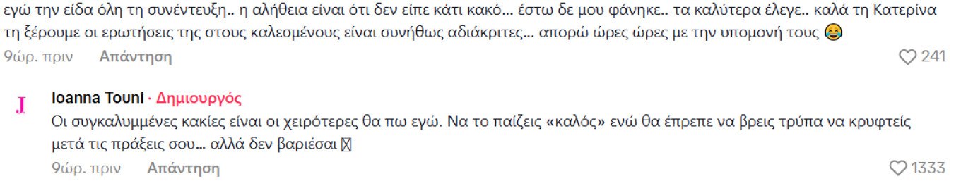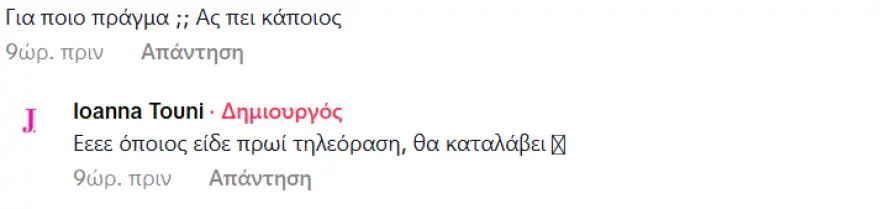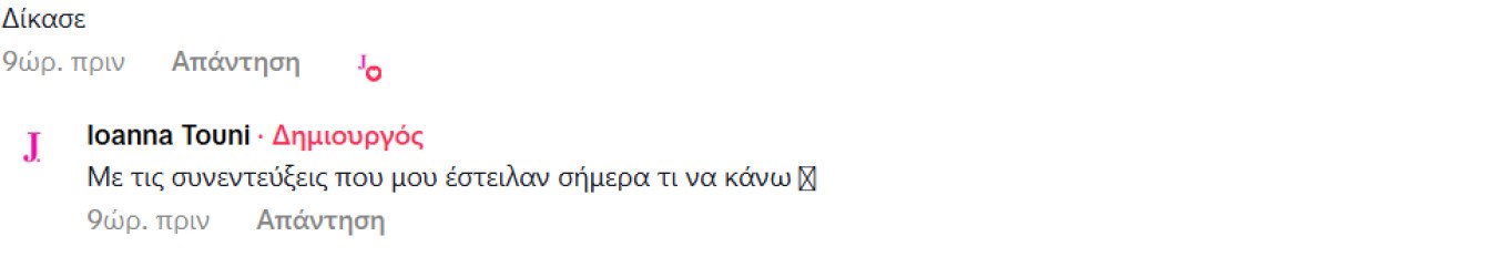 Ένα άλλο σχόλιο ανέφερε: «Δίκασε», με την Ιωάννα Τούνη να σημειώνει: «Με τις συνεντεύξεις που μου έστειλαν σήμερα τι να κάνω». Όσο σε ακόλουθο που τη ρώτησε «για ποιο πράγμα» μιλούσε, εκείνη απάντησε: «Εεεε όποιος είδε πρωί τηλεόραση, θα καταλάβει».