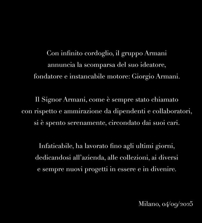 Λίγο μετά την είδηση του θανάτου του, την Πέμπτη 4 Σεπτεμβρίου, δημοσιεύτηκε επίσημη ανακοίνωση στα social media από τον Οίκο Αρμάνι, αναφέροντας ότι ο σχεδιαστής πέθανε ήρεμα, περιτριγυρισμένος από τα αγαπημένα του πρόσωπα. Όσο για την κηδεία του σημειώθηκε ότι ήταν επιθυμία του να τελεστεί ιδιωτικά, ενώ η σορός του θα τεθεί σε λαϊκό προσκύνημα το Σάββατο 6 Σεπτεμβρίου και την Κυριακή 7 Σεπτεμβρίου από τις 9 π.μ. μέχρι τις 6 μ.μ. στο Μιλάνο, μέσα στο Armani/Teatro.