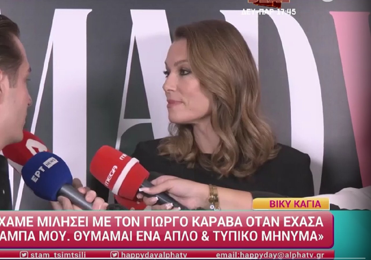 Για τη σχέση της με τον Γιώργο Καράβα, ανέφερε ότι δεν υπήρξε επικοινωνία πέρα από ένα τυπικό μήνυμα και τόνισε ότι ο χρόνος αποκαλύπτει την αλήθεια για τις σχέσεις.