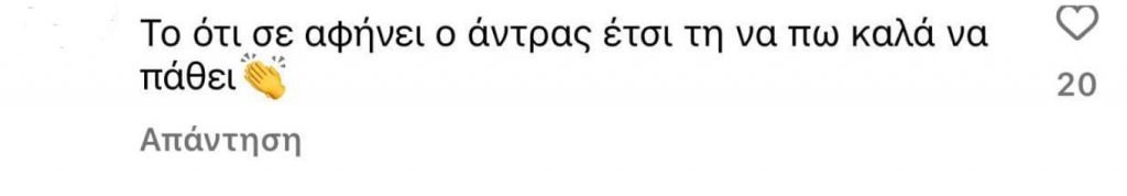 Η ανάρτηση προσέλκυσε πολλά σχόλια, αλλά ένα συγκεκριμένο ήταν αρκετά προσβλητικό. Μία follower της έγραψε κάτω από τις φωτογραφίες: «Tο ότι σε αφήνει ο άντρας έτσι, τι να πω καλά να πάθει».
