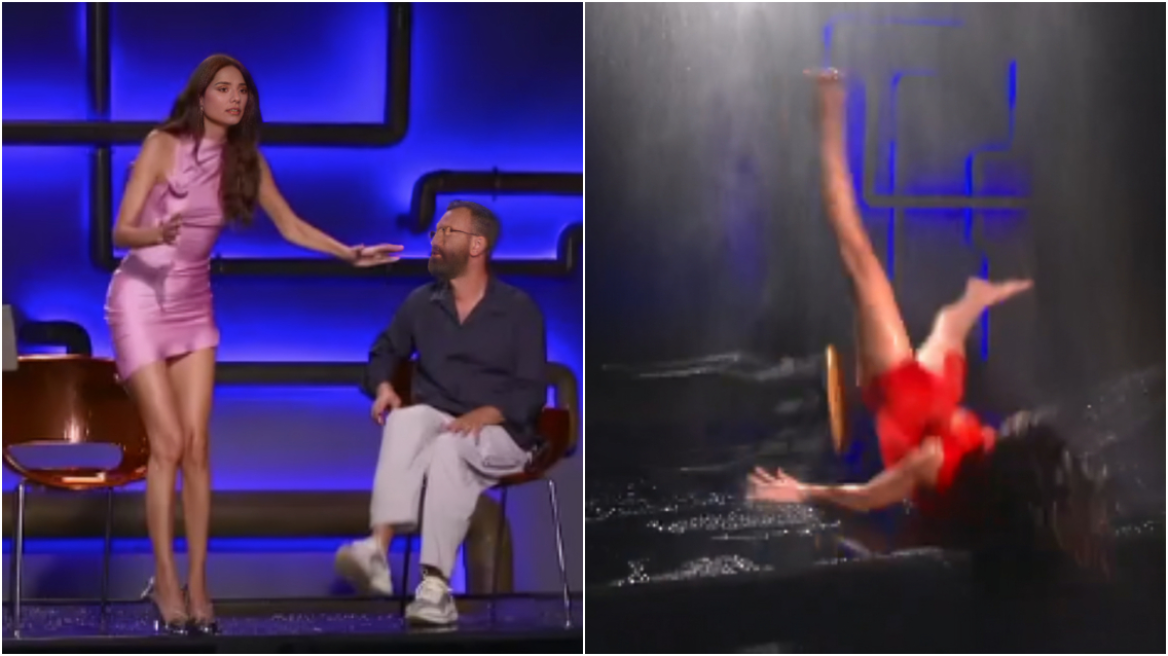 Συγκεκριμένα, το μοντέλο φαίνεται στο βίντεο να γλιστράει από την καρέκλα και να καταλήγει στο έδαφος με την πλάτη της, προκαλώντας αναστάτωση στο πλατό.