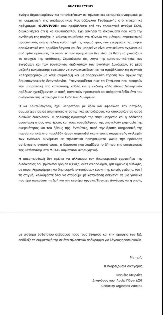 Αυτή τη στιγμή, καλούμαστε όλοι να σταθούμε με κατανόηση απέναντι σε μία γυναίκα που έχει αφιερώσει τη ζωή και την καριέρα της στις ένοπλες δυνάμεις και η οποία με αίσθημα βαθύτατου σεβασμού προς τους θεσμούς και την ιεραρχία των ΕΔ επιδίωξε την συμμετοχή της σε ένα τηλεοπτικό πρόγραμμα για λόγους προσωπικούς».