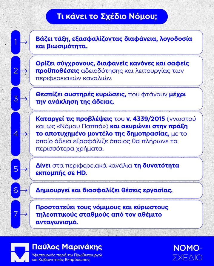 Ο Υφυπουργός παρά τω Πρωθυπουργώ και Κυβερνητικός Εκπρόσωπος Παύλος Μαρινάκης δήλωσε: «Με το τρίτο νομοσχέδιο που έρχεται μέσα σε τέσσερις μήνες για το χώρο των ΜΜΕ, φιλοδοξούμε να βάλουμε σε τάξη το τοπίο της αδειοδότησης των περιφερειακών καναλιών που ήταν αρρύθμιστο για πάνω από 20 χρόνια, με τέτοιο τρόπο, ώστε, να προστατεύονται οι υγιείς επιχειρήσεις που τηρούν τις προβλέψεις του νόμου, σέβονται τους εργαζομένους τους και δημιουργούν ποιοτικό περιεχόμενο για το τηλεοπτικό κοινό. Στόχος μας είναι να διασφαλίσουμε μια ξεκάθαρη διαδικασία αδειοδότησης, η οποία θα υλοποιείται από το ΕΣΡ, ώστε όλοι οι τηλεοπτικοί σταθμοί της περιφέρειας να αποκτήσουν ένα ανταγωνιστικό μερίδιο στην αγορά, δίνοντας φωνή στον τόπο τους, χωρίς, όμως, τις λογικές δημοπρασίας του παρελθόντος που καθιστούσαν το τηλεοπτικό τοπίο ένα «κλειστό κλαμπ» για λίγους και εκλεκτούς. Διαφάνεια- Λογοδοσία- Βιωσιμότητα είναι το τρίπτυχο που διαπνέει το νομοσχέδιο, με το οποίο γίνονται πράξη πάγια αιτήματα των περιφερειακών καναλιών, όπως προέκυψαν από την εκτεταμένη διαβούλευση που έγινε και συνεχίζεται με τους φορείς, τους οποίους θα ήθελα να ευχαριστήσω για την ουσιαστική και διαρκή συνεργασία».