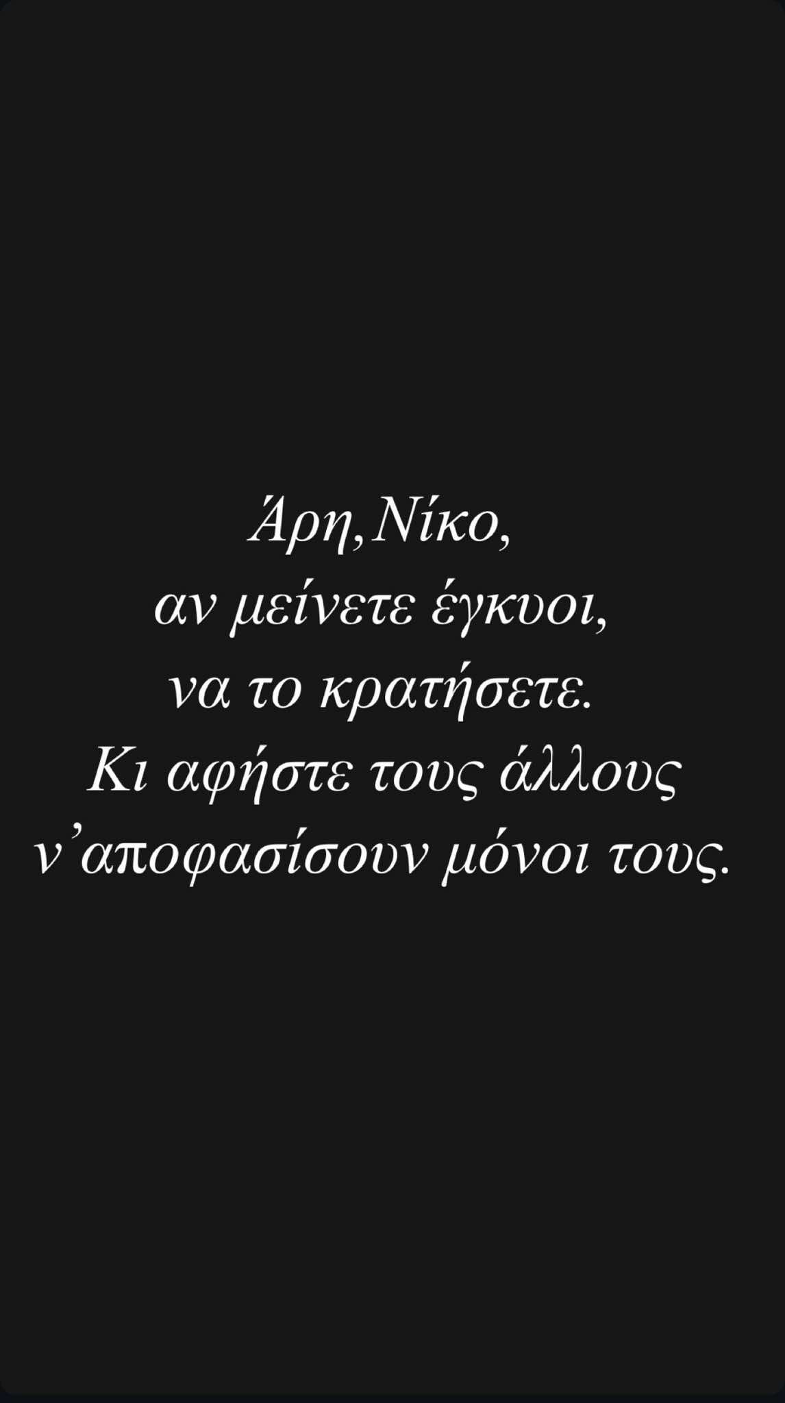 Όπως θα ήταν αναμενόμενο, προκάλεσε έντονες αντιδράσεις στον καλλιτεχνικό κόσμο, που εκφράστηκαν μέσα από αναρτήσεις στα social media και τηλεοπτικές δηλώσεις. Μεταξύ αυτών, η Γιούλικα Σκαφιδά έγραψε σε ένα Insta story της: «Άρη, Νίκο, αν μείνετε έγκυοι, να το κρατήσετε. Κι αφήστε τους άλλους ν’ αποφασίσουν μόνοι τους».