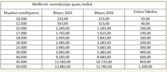 Σύμφωνα με πίνακα που δημοσίευσε το ertnews το νέο καθεστώς για τους φόρους εισοδήματος για μισθωτούς και συνταξιούχους χωρίς παιδιά διαμορφώνεται ως εξής:
