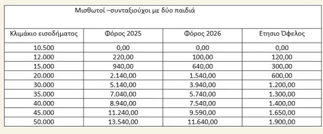 Το καθεστώς των άμεσων φόρων εισοδήματος για τους μισθωτούς και συνταξιούχους με παιδιά από την 1η Ιανουαρίου 2026 θα έχει ως εξής: