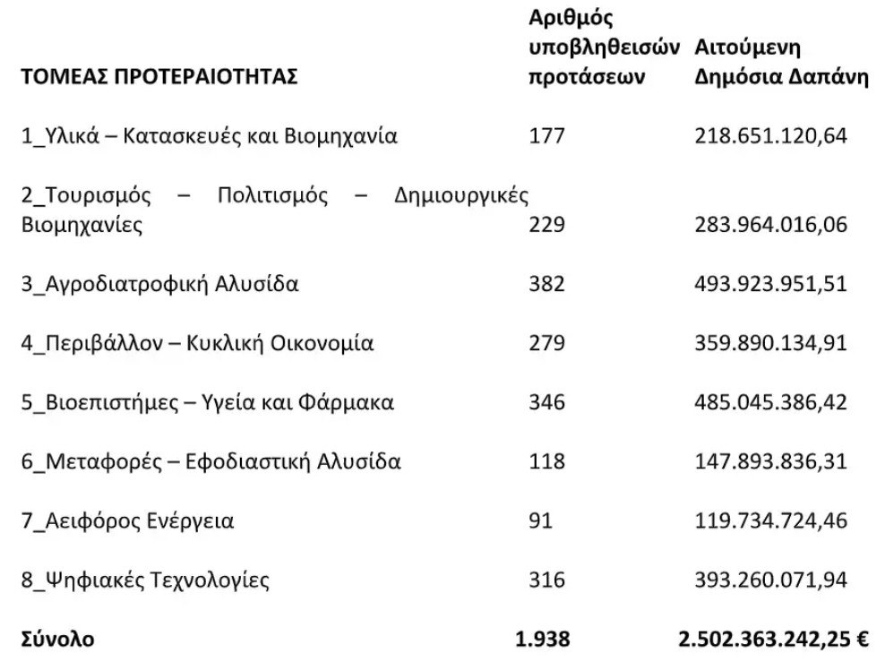 Στον πίνακα φαίνονται αναλυτικά στοιχεία των προτάσεων που υποβλήθηκαν ανά τομέα προτεραιότητας.