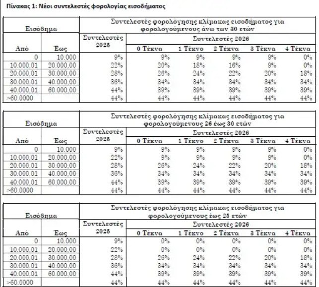 Ειδικό καθεστώς προβλέπεται για τους νέους. Έως 25 ετών, οι συντελεστές μηδενίζονται στο εύρος 0–20.000 ευρώ. Για ηλικίες 26–30 ετών, ο συντελεστής 10.000–20.000 ευρώ περιορίζεται στο 9% (το 0–10.000 παραμένει 9%), ενώ οι υπόλοιπες κλίμακες είναι ίδια με των άνω των 30.