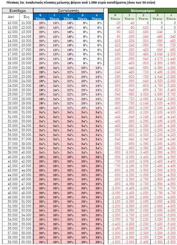 Στην ρύθμιση ενσωματώνεται και μια δημογραφική διάσταση με επιπλέον πριμ σε οικογένειες με παιδιά. Στο εύρος 10.000–20.000 ευρώ ο συντελεστής γίνεται 20% για όσους δεν έχουν παιδιά, 18% με ένα παιδί, 16% με δύο, 9% με τρία και 0% για τέσσερα ή περισσότερα. Στην κλίμακα 20.000–30.000 ευρώ ο συντελεστής μειώνεται κατά 2 μονάδες ανά παιδί (26%, 24%, 22%, 20%, 18%). Τα κλιμάκια 30.000–40.000, 40.000–60.000 και άνω των 60.000 είναι ίδια για όλους (34%, 39%, 44%).